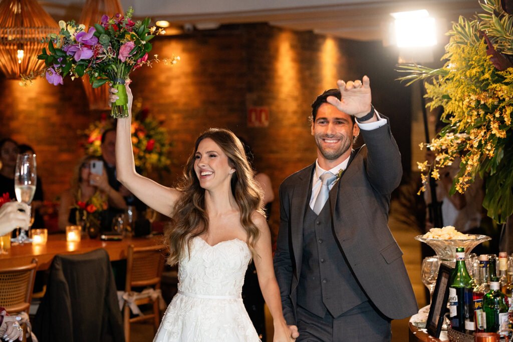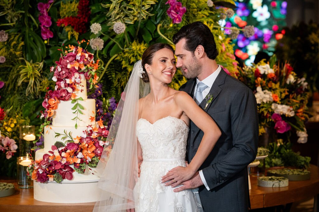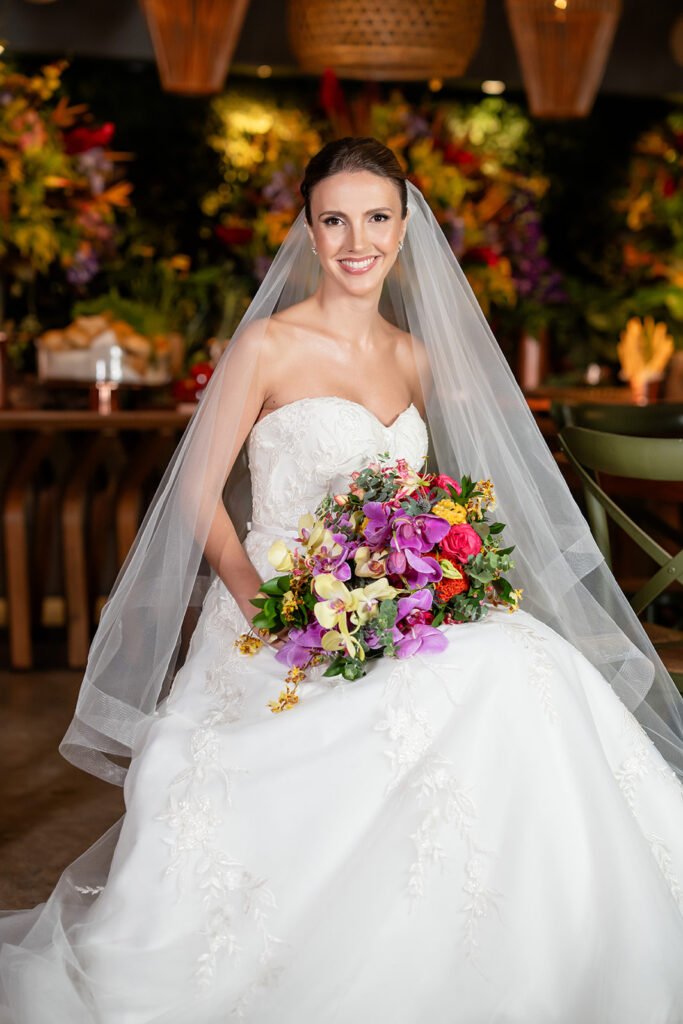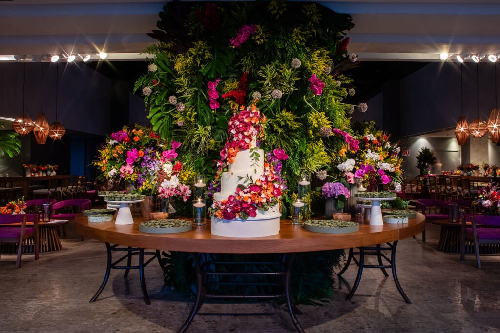 A decoração foi produzida pela Efemera, que soube captar muito bem as ideias e a essência da noiva. A Pri é uma daquelas pessoas super alto astral,  e ela transparece isso a partir das cores, tons vibrantes, flores e estampas e a decoração foi exatamente assim, uma mistura de cores intensas de uma forma super elegante.