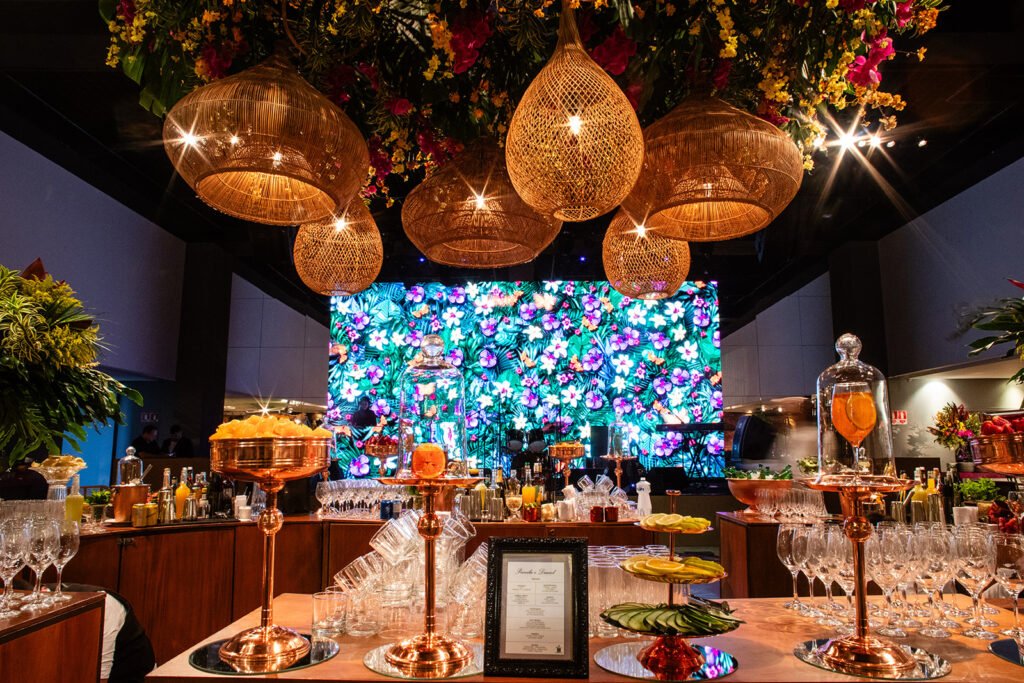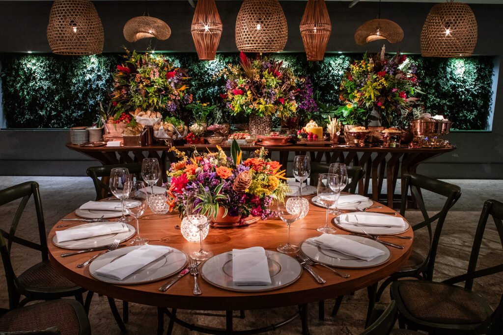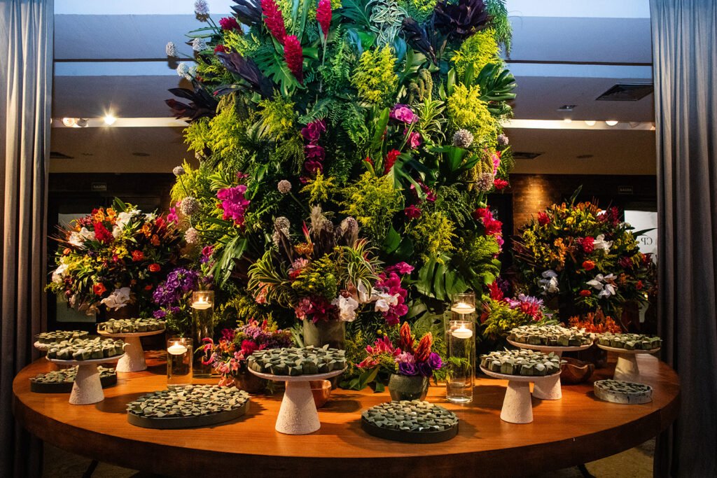 Uma curiosidade super legal que tornou essa decoração ainda mais única foi o envolvimento da família da Pri, que possui uma empresa de tecidos e estamparia. Ela tinha um desejo muito grande de que utilizássemos os tecidos da família em detalhes da festa. Assim, mesas, poltronas e almofadas foram revestidas com esses materiais, conferindo um toque ainda mais especial, familiar e exclusivo a esse dia.