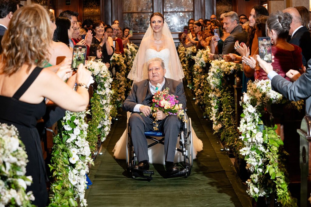 Por motivos de forças maiores, Pri e Dani tiveram seu casamento adiado por quase um ano. O pai da #NoivaSF enfrentou graves problemas de saúde durante a organização do casamento e por este motivo ela decidiu esperar até que ele se recuperasse. E assim foi, Pri sonhou e conseguiu eternizar um dos momentos mais importantes da vida dela: entrar com seu pai na cerimônia.