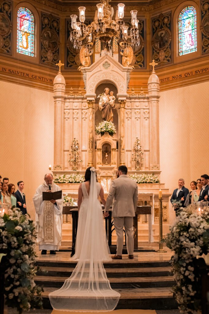 A primeira cerimônia foi mais intimista, realizada no salão de festas do prédio dos pais da noiva, com poucos convidados e uma cerimônia religiosa.